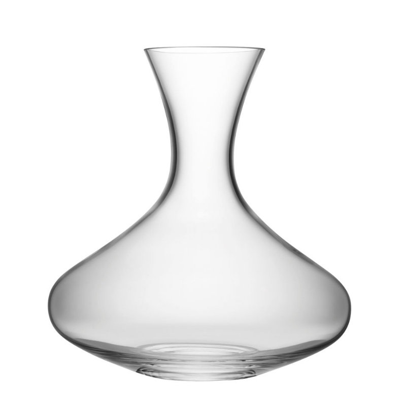 A mouth-blown glass carafe with wide base, narrowing at the neck and flaring towards the rim. The wide base allows maximum surface area for the aeration of wine. Mouth-blown glass Curved shape Broad base